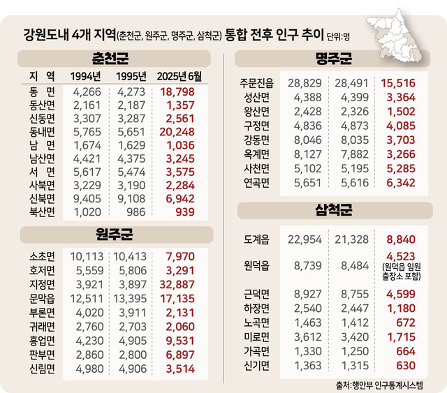 강릉과 삼척은 현재 인구가 통합 당시보다 더 적다.