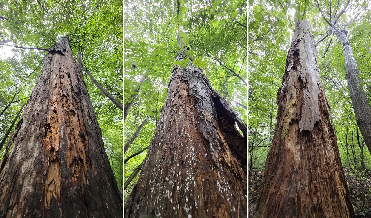 나무의 썩은 정도가 고사된 지 수년째임을 보여준다. 이게 지금 우리 숲의 현실이다.