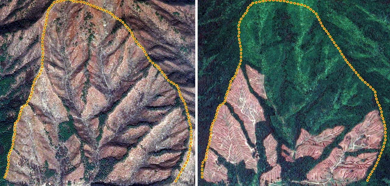 산불 발생 후 복원한다며 불타지 않은 활엽수까지 싹쓸이 벌목했다.