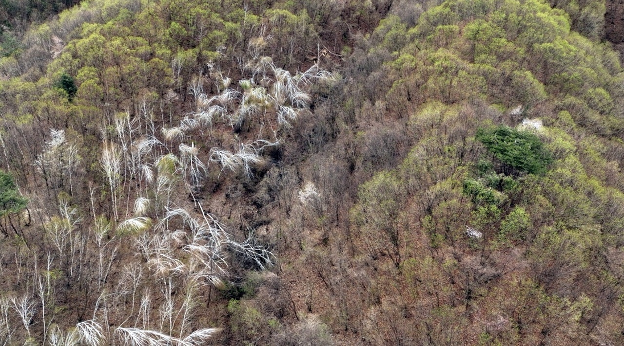 그런데 낙엽송이 점으로 보이는 이유는 조림한 낙엽송들이 다 고사되고 일부만 살아남았기 때문이다.