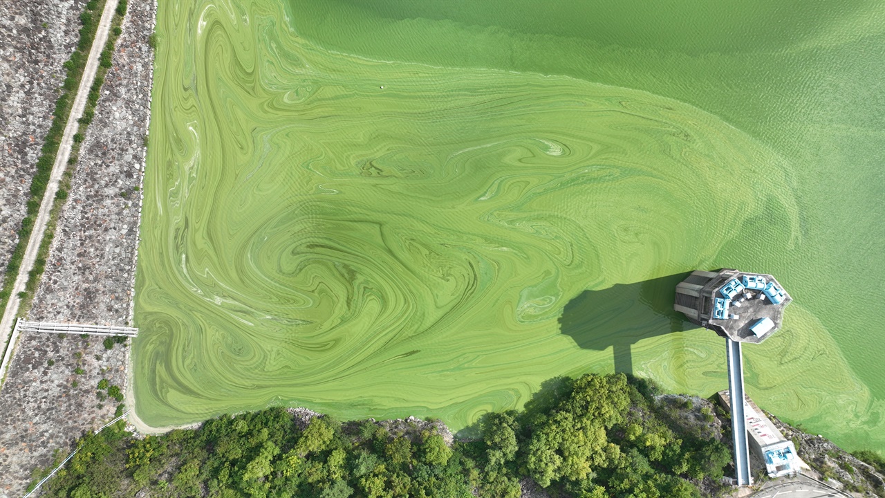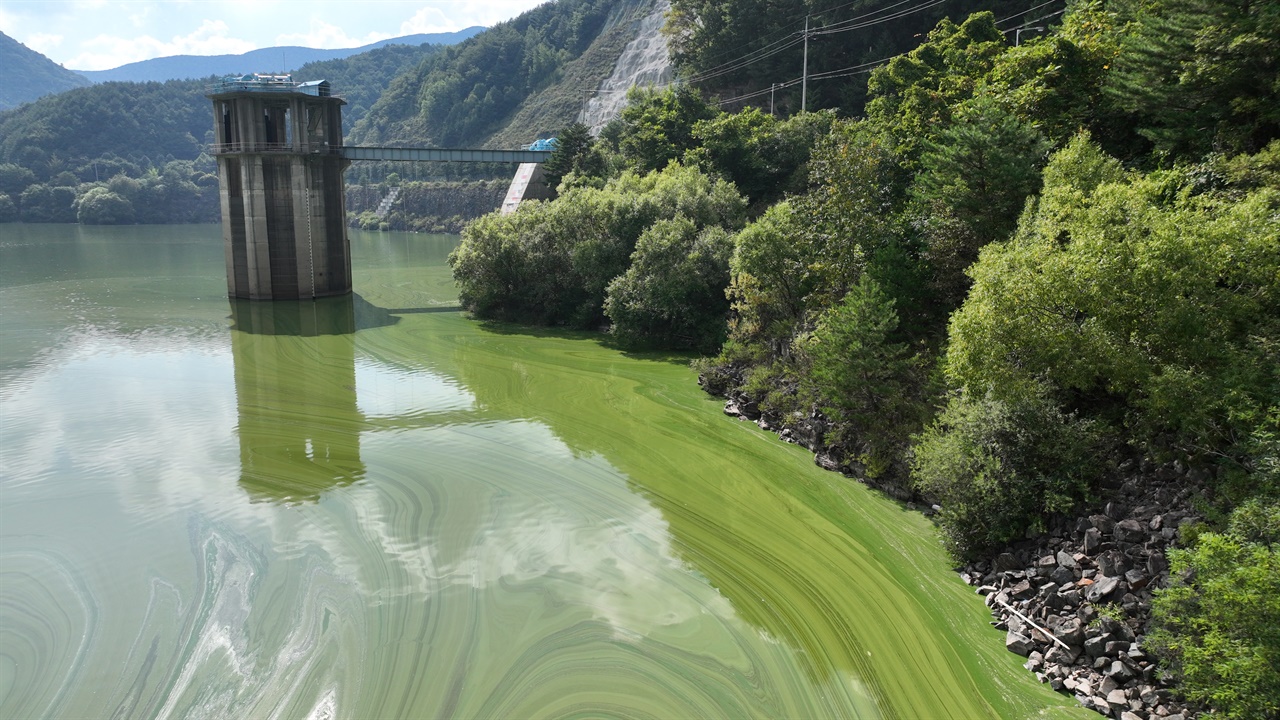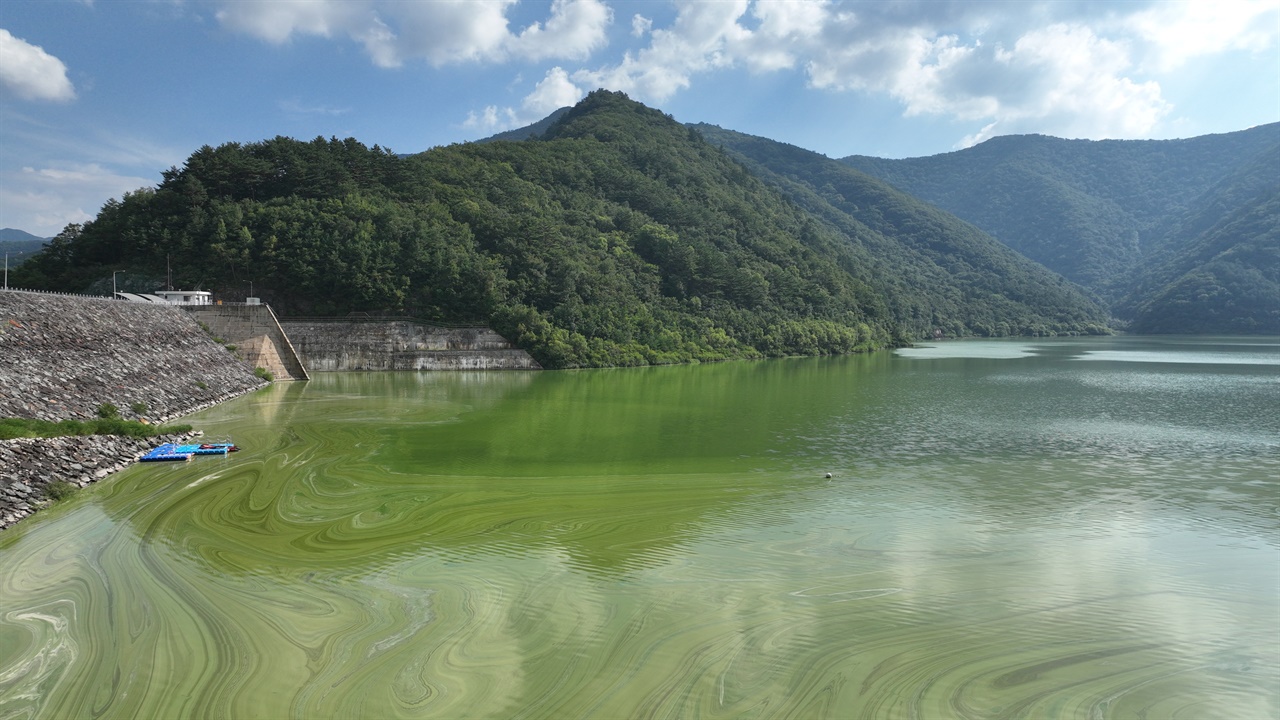▲도암댐 위 수면에는 녹조가 마치 초록 물감으로 그려 놓은 그림처럼 펼쳐져 있다.