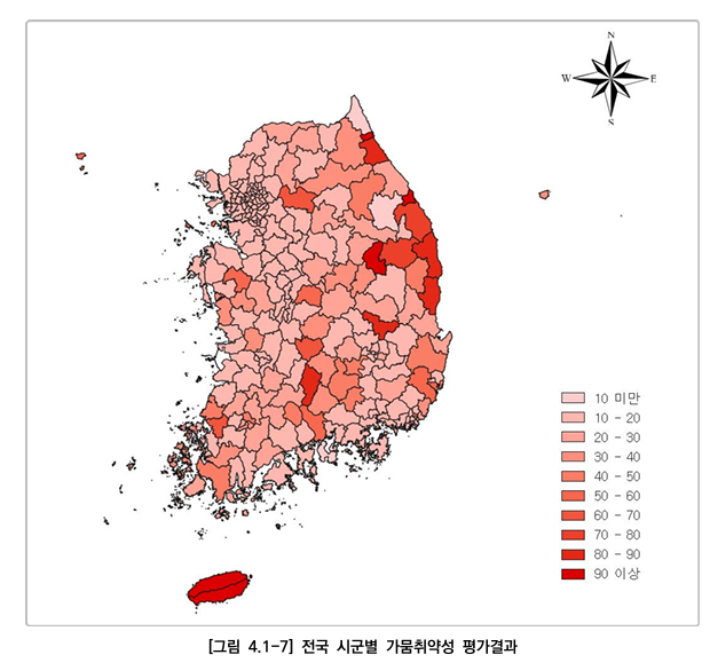 연구팀이 최근 30년간 가뭄 발생 빈도와 지속 기간을 기준으로 한 '노출도'와 인구·농업 의존도를 반영한 '민감도', 가뭄 발생 시 버틸 수 있는 저수 능력을 뜻하는 '대응능력', 보조 수원 확보 여부까지 가중치를 적용해 평가한 결과 속초·동해·고흥·보령·거제·울릉·제주 등 12개 시·군이 Ⅴ(매우 취약) 또는 Ⅳ(취약) 등급으로 분류됐다.