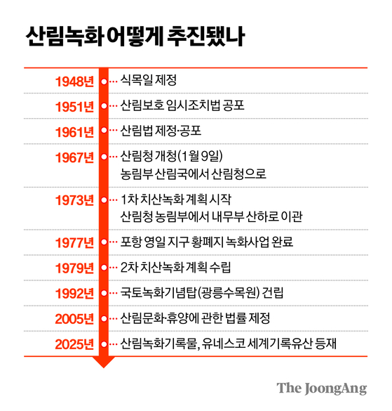 해방 직후에도 산림 복구 시도는 있었다. 1948년 식목일(4월 5일)을 제정했다. 이듬해엔 공휴일로 지정, 매년 행사를 열었다. 이승만 정부는 산림보호임시조치법을 제정하며 나무 심기를 강조했지만 효과는 미미했다. 그마저도 6·25로 물거품이 됐다. 박정희 정부가 들어선 후 비로소 산림녹화는 국가 시책으로 추진됐다.