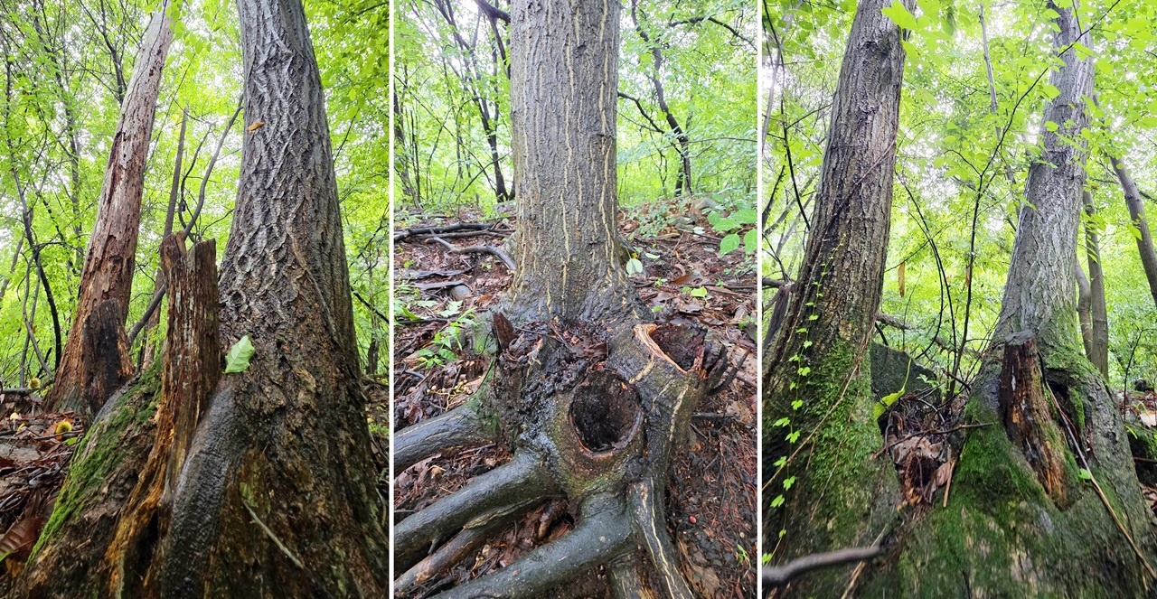 나무의 썩은 정도가 고사된 지 수년째임을 보여준다. 이게 지금 우리 숲의 현실이다.