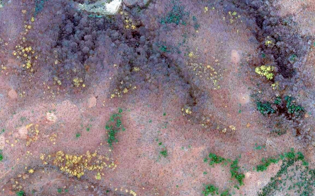 항공사진에서 여기저기 노란 점처럼 흩어져 있는 것이 단풍 든 낙엽송이다.