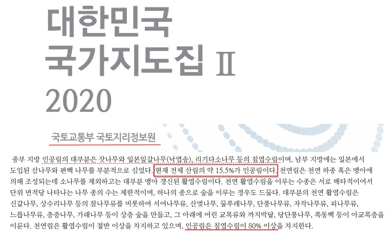 <대한민국 국가지도집Ⅱ>(2020년)에 따르면 산림청이 지난 65년 동안 조림한 인공림은 고작 15.5%에 불과했다.