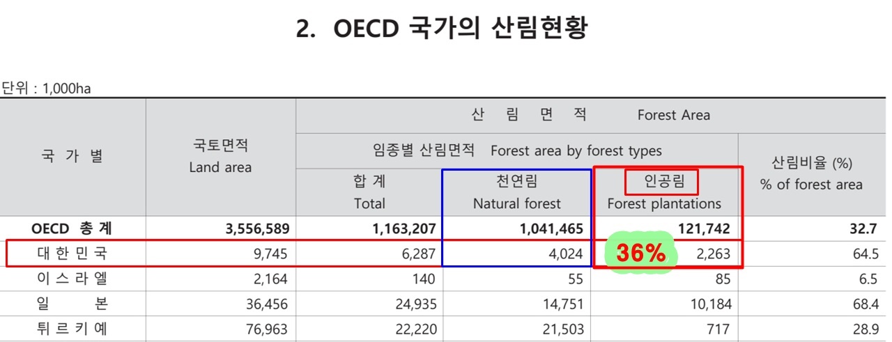 국토지리원의 인공림 면적 15.5%의 두 배가 넘는 36%라고 이야기해왔다.