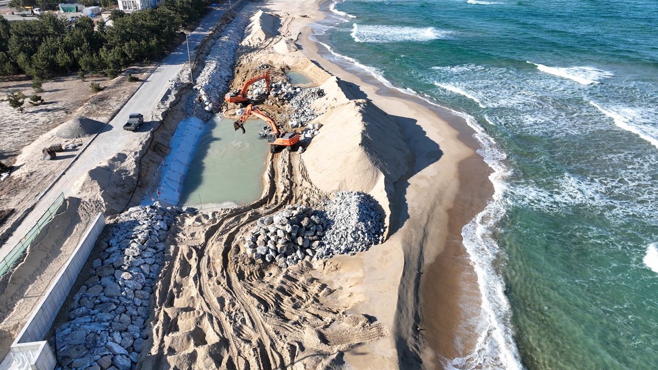 2026년 1월, 강릉시 주문진읍 향호리 해안가에서는 해안도로 공사가 한창이다.