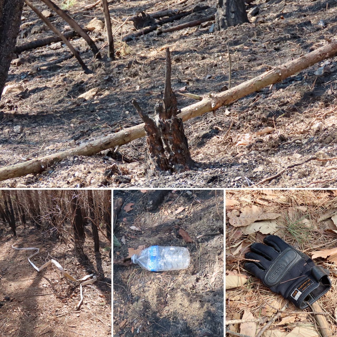 산불이 낸 열에 절단된 소방호스와 진화대원이 남기고 간 구조 전문용 장갑 등이