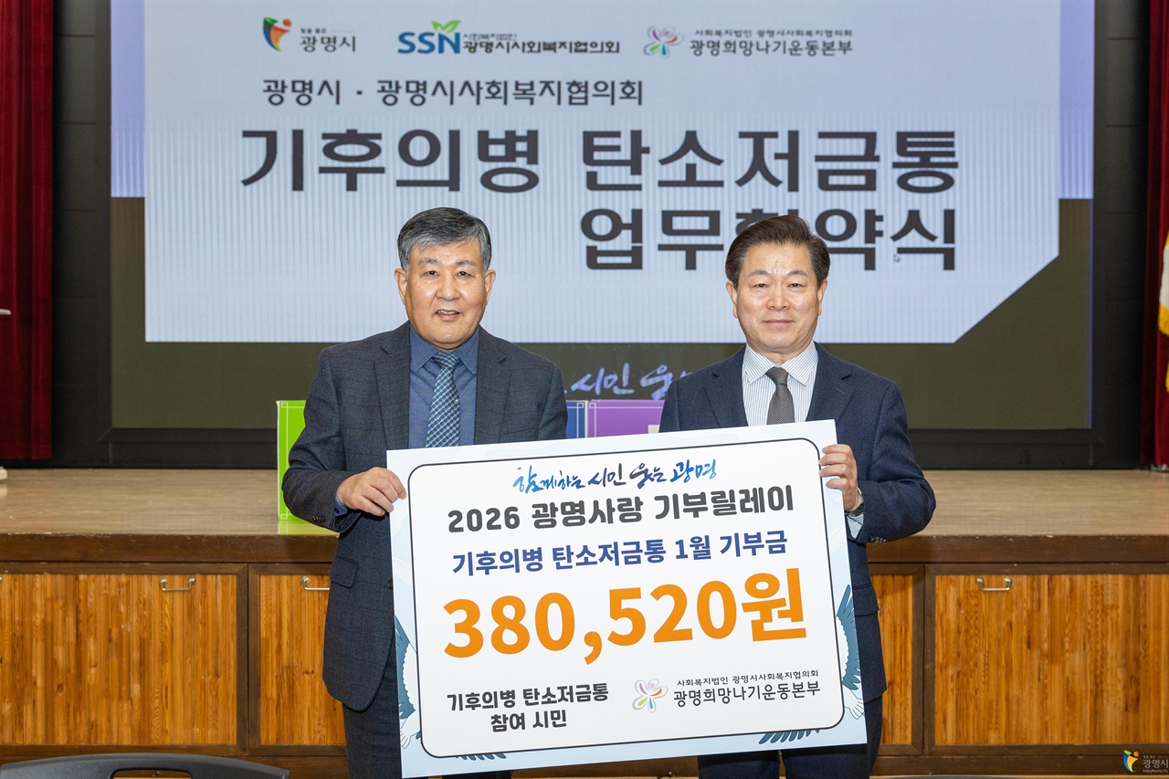 광명시는 또한 기후의병 탄소저금통 사업을 올해 확대·운영한다. 광명시는 13일 광명시사회복지협의회와 '기후의병 탄소저금통 기부금 조성 협약'을 체결하며 탄소중립 실천 인센티브를 기후 취약계층 지원으로 연계하는 적립금 기부 제도를 본격 운영한다고 밝혔다.